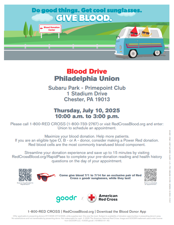The Philadelphia Union is hosting a Blood Drive in the Primepoint Club at Subaru Park on July 10th from 10am-3pm. Help us reach our goal of 35 pints of donated blood! Please sign up on U-serve and the link below to reserve your spot.